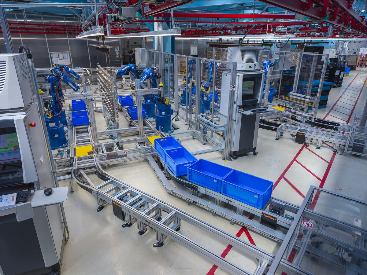 Picture: Eight MOTOMAN GP12 robots then remove the components and place them in SLCs.